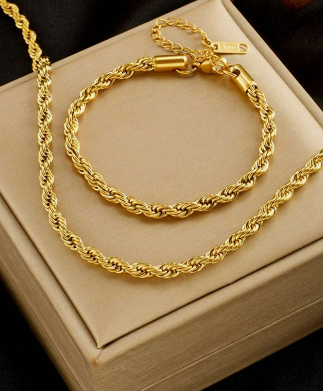 Exprimez votre style avec cet ensemble tressé au design affirmé. Composé d’un collier en chaîne torsadée et d’un bracelet assorti, cet ensemble doré en acier inoxydable séduit par son esthétique robuste et élégante. Parfait pour les amateurs de bijoux urbains au style hip-hop raffiné.