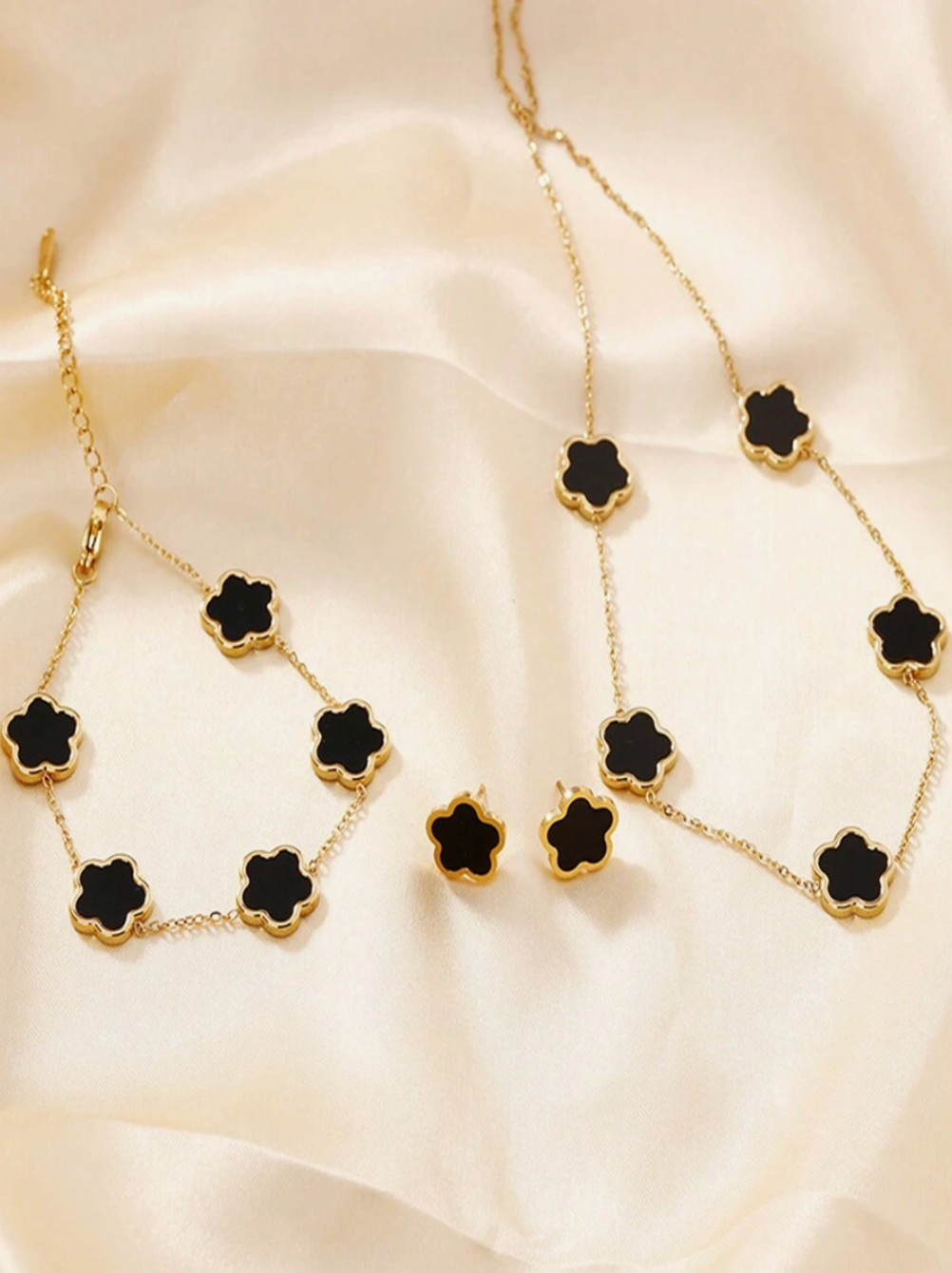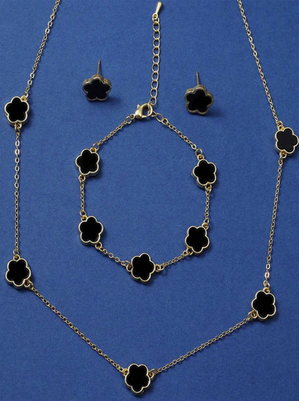 Élégance et symbolique se rencontrent dans cette parure noire composée de 3 pièces : un collier, un bracelet et des boucles d’oreilles, chacun orné d’un trèfle à quatre feuilles stylisé. Sa finition dorée contraste avec le noir profond pour un rendu chic et intemporel.